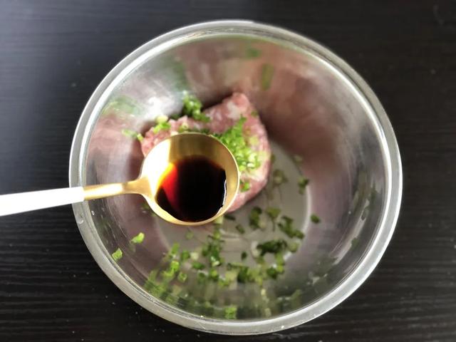 2.猪肉馅儿中加入适量香葱碎,可以根据个人口味加一点虾仁碎、胡萝卜碎,都是可以的。