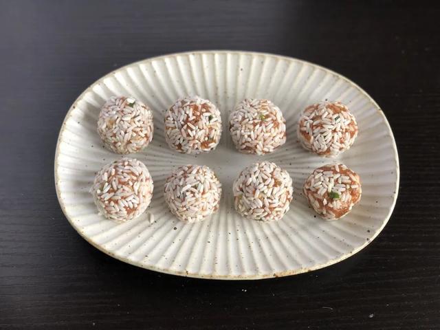 5. 揉成大小适中丸子,在剩余泡发的糯米中滚几圈,让糯米包裹丸子,用手稍微捏紧实一些,糯米不会掉落就可以。摆入盘中。