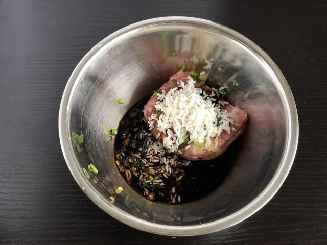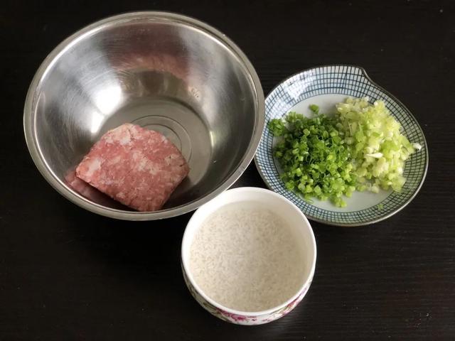 1. 糯米提前浸泡4-5小时备用(糯米我用的是长粒的,个人觉得长粒糯米比圆糯米做出的丸子要好看一点),猪肉以瘦为主,剁成肉糜,香葱切碎。
