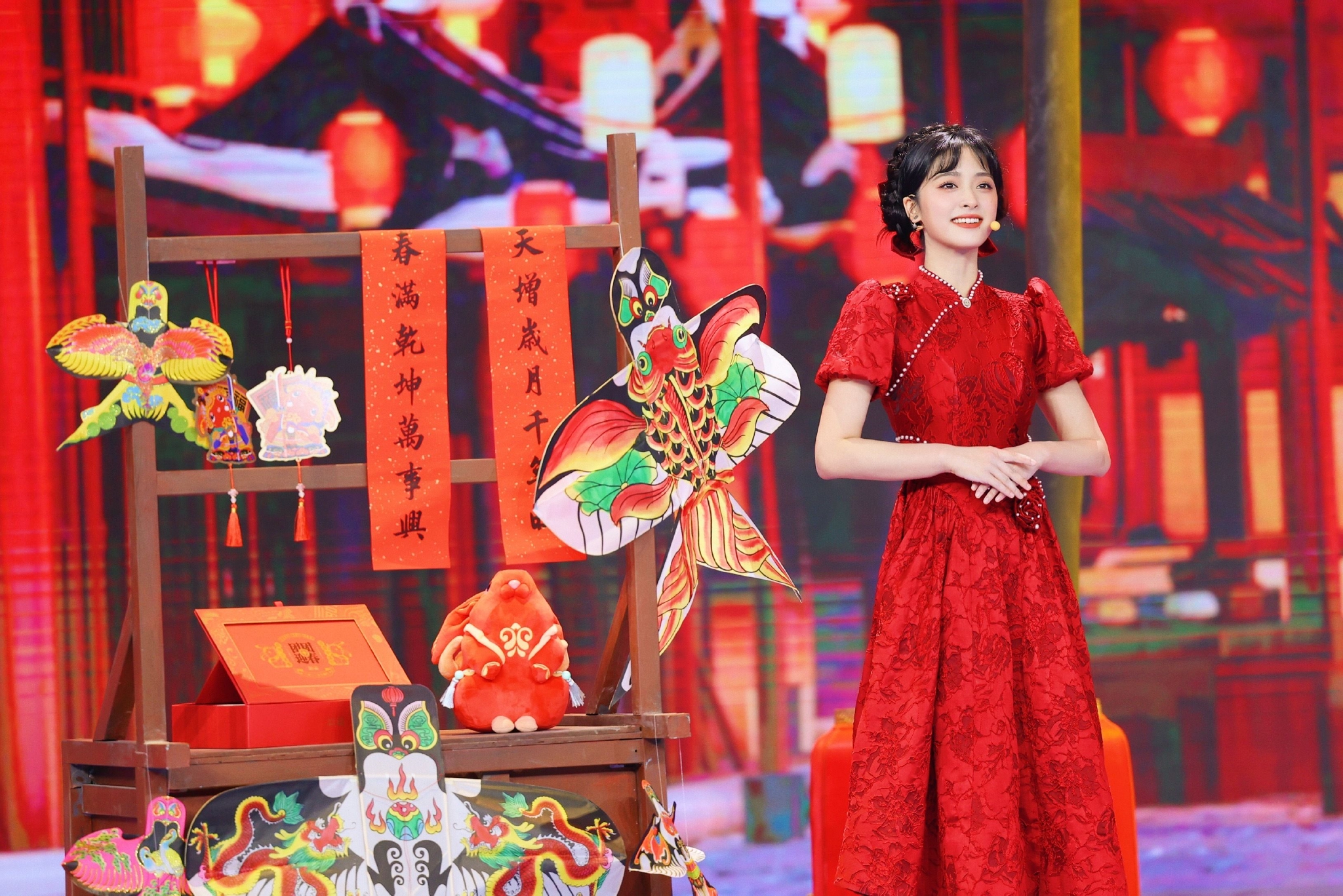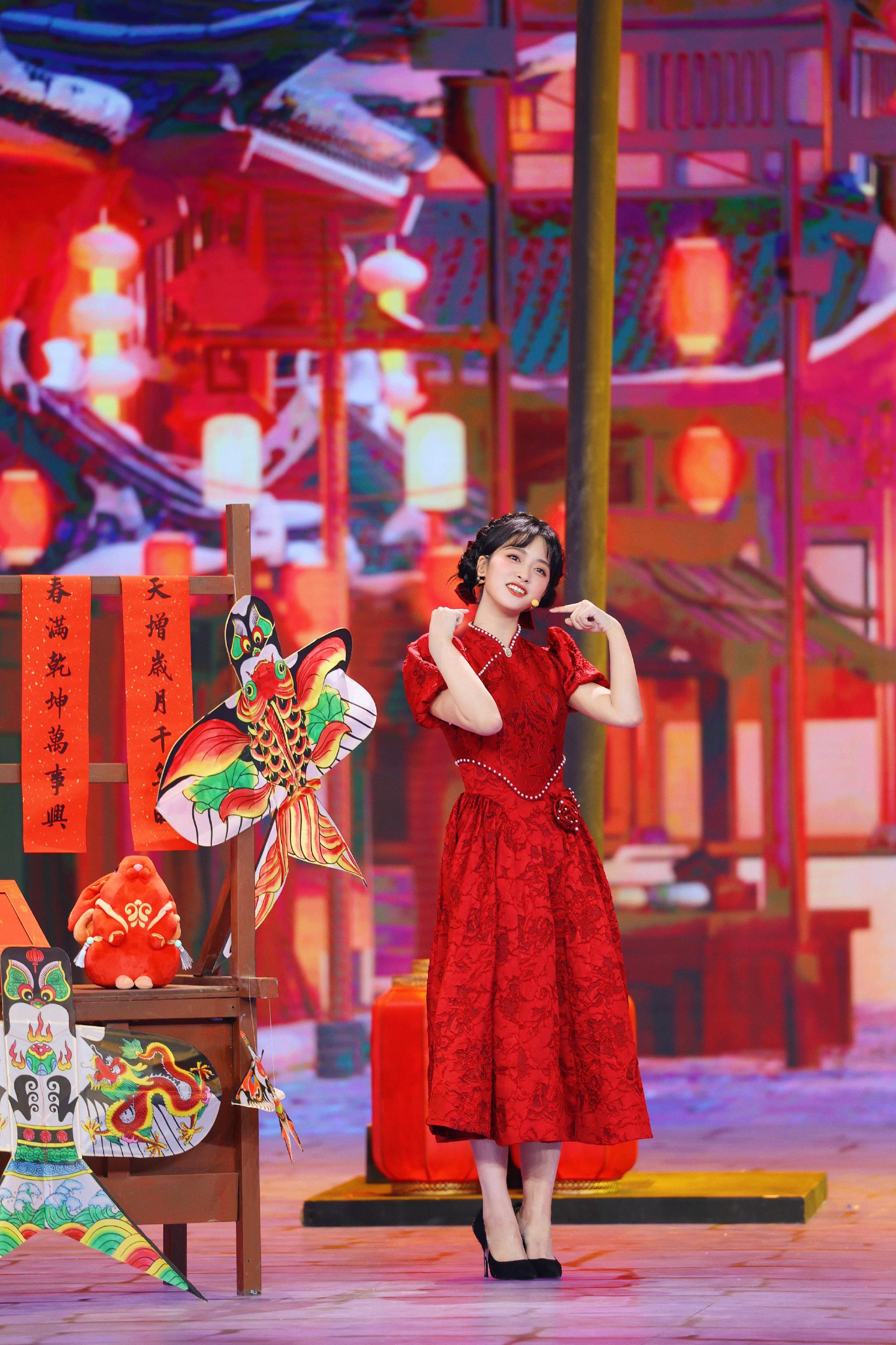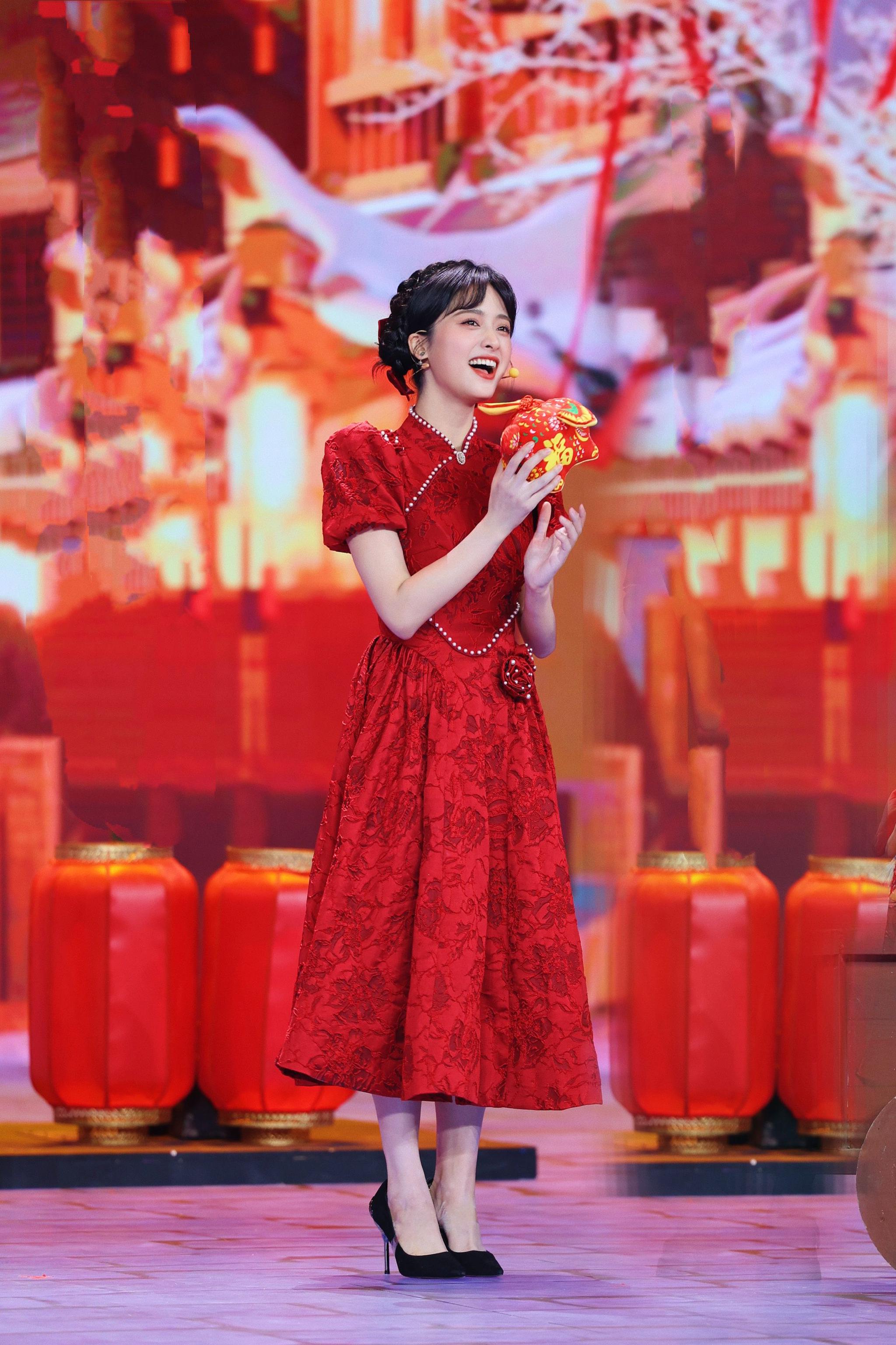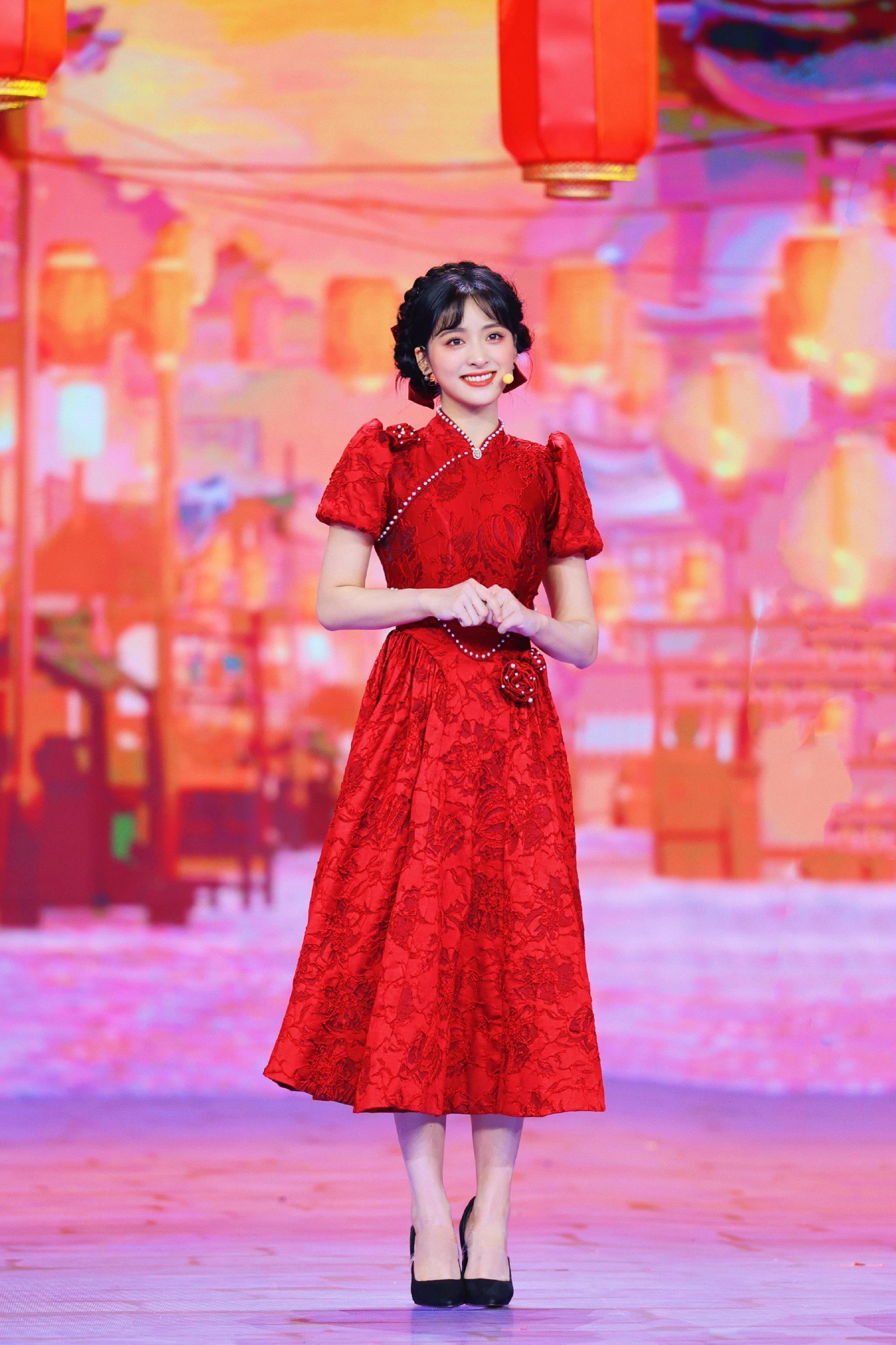 #沈月兔年新春大片# 沈月兔年新春大片来啦,红色珍珠连衣裙+盘发造型,温柔甜美的月月新年快乐 新年福气满满#沈月红色珍珠连衣裙造型#