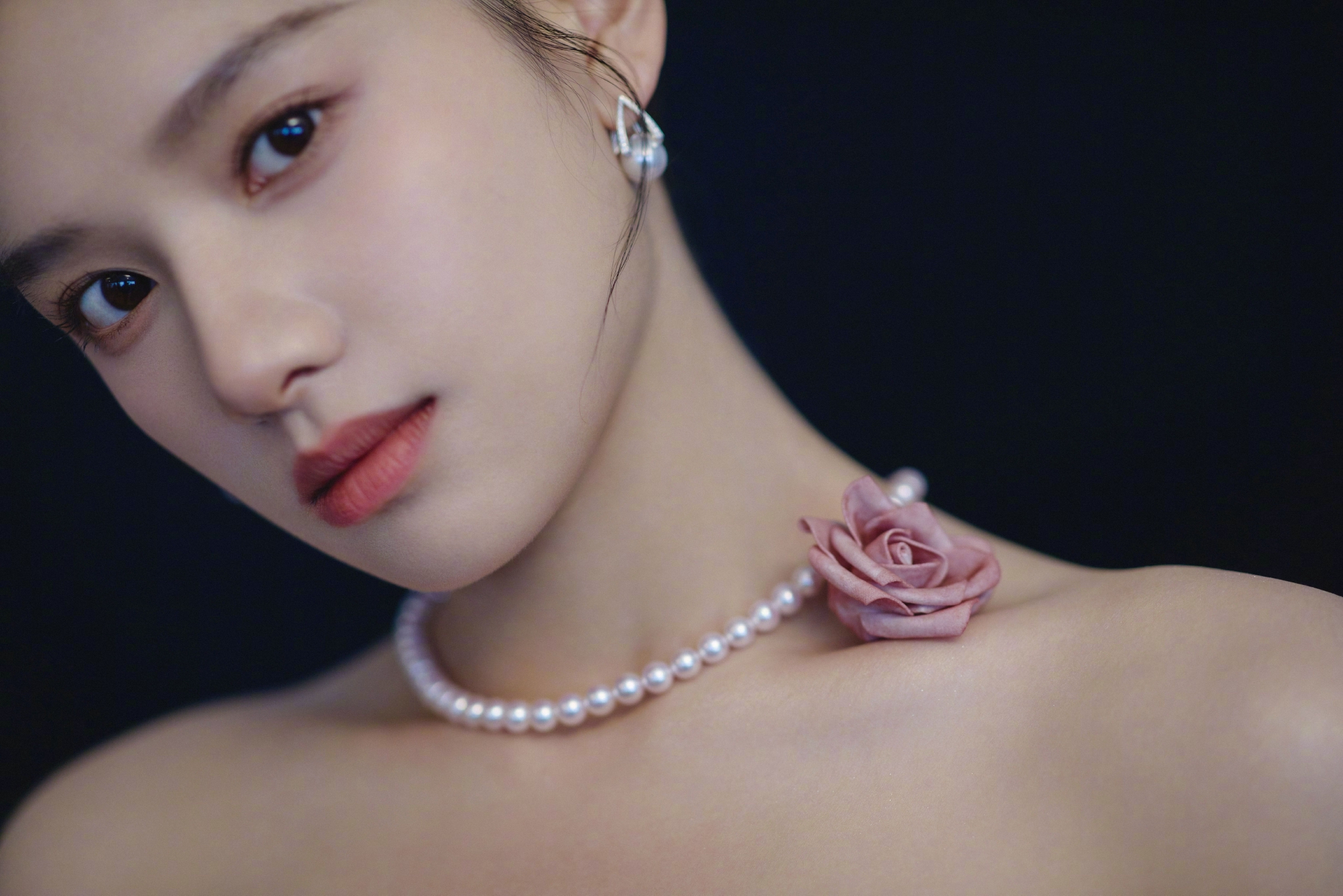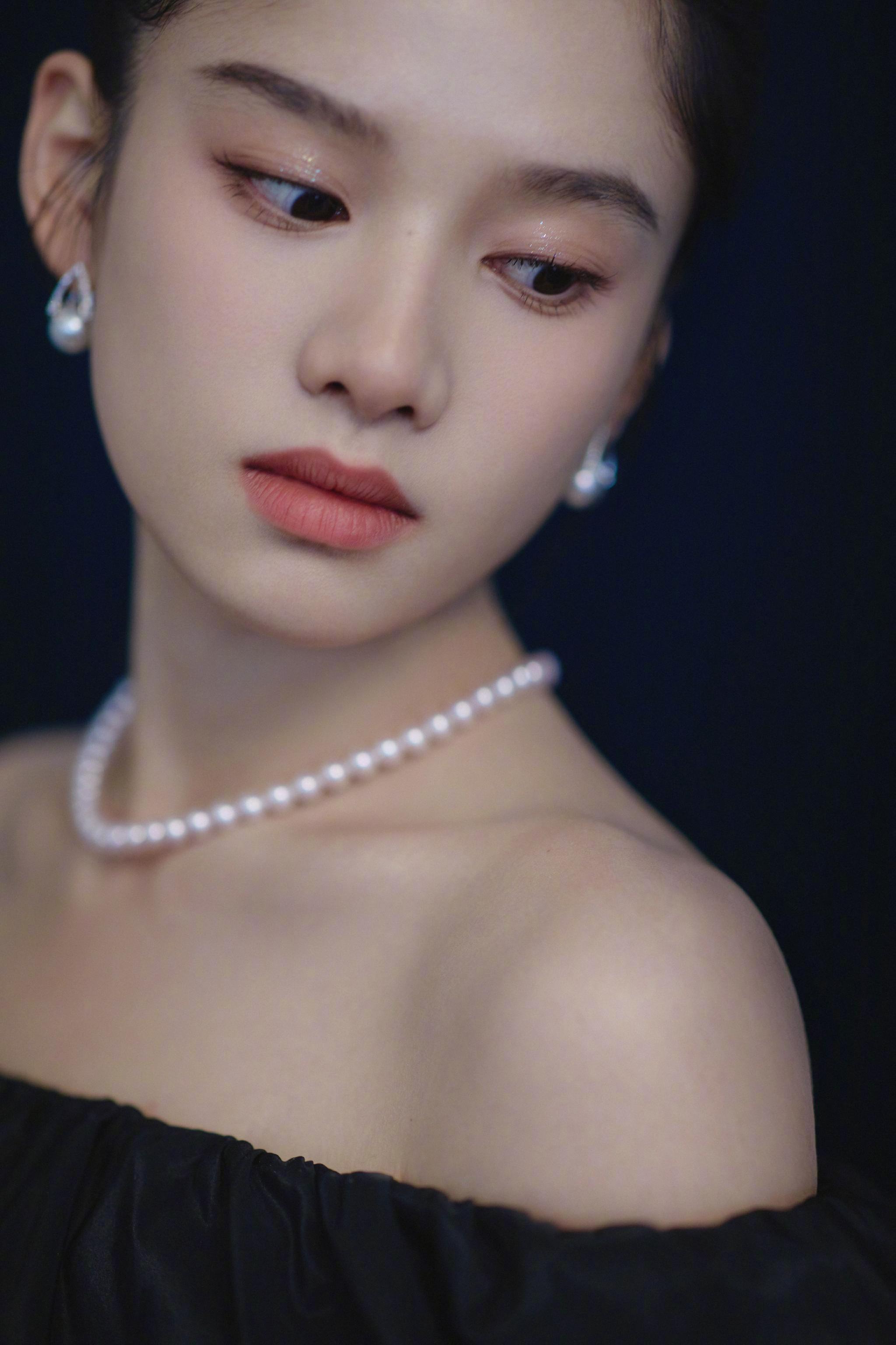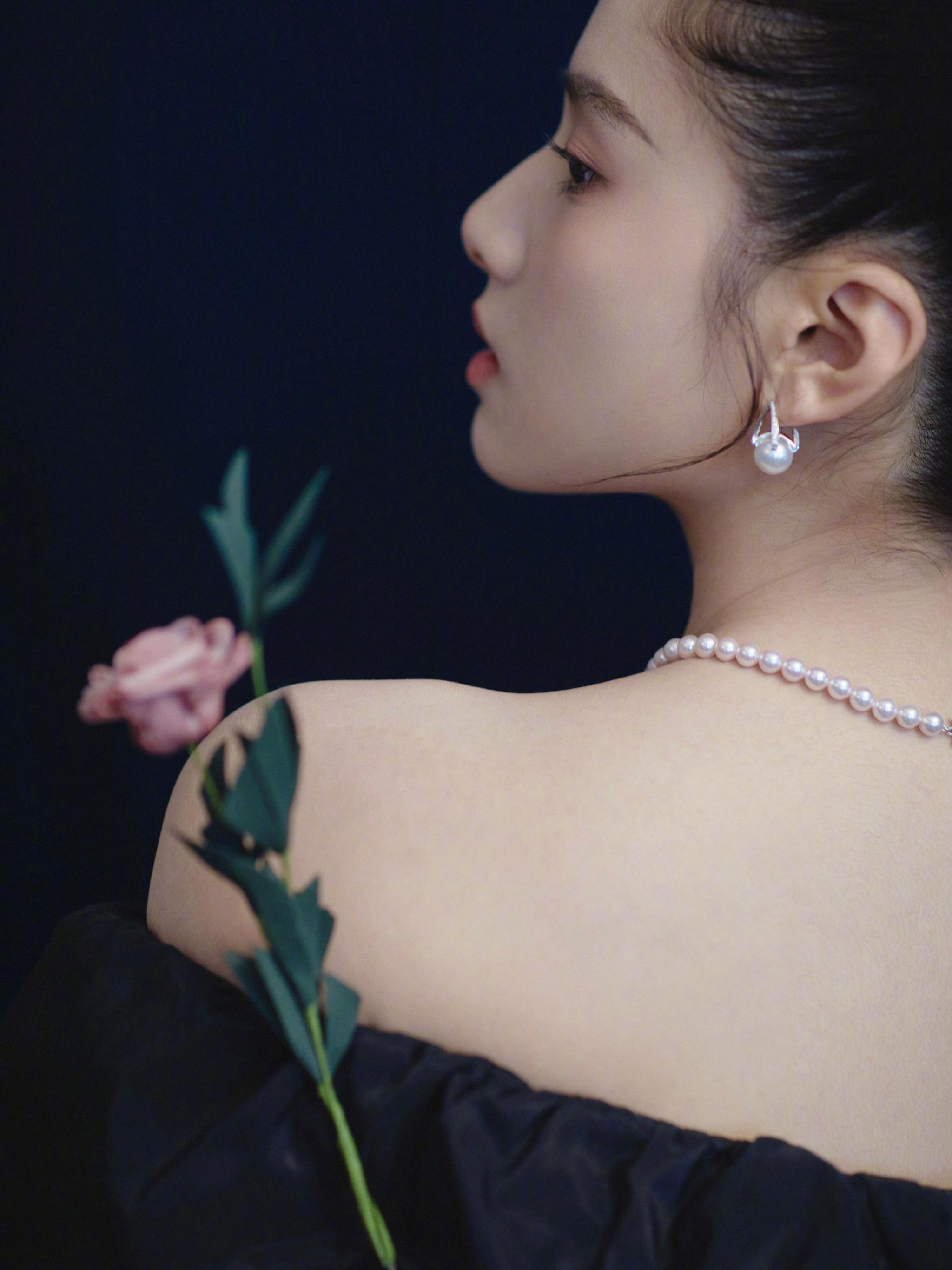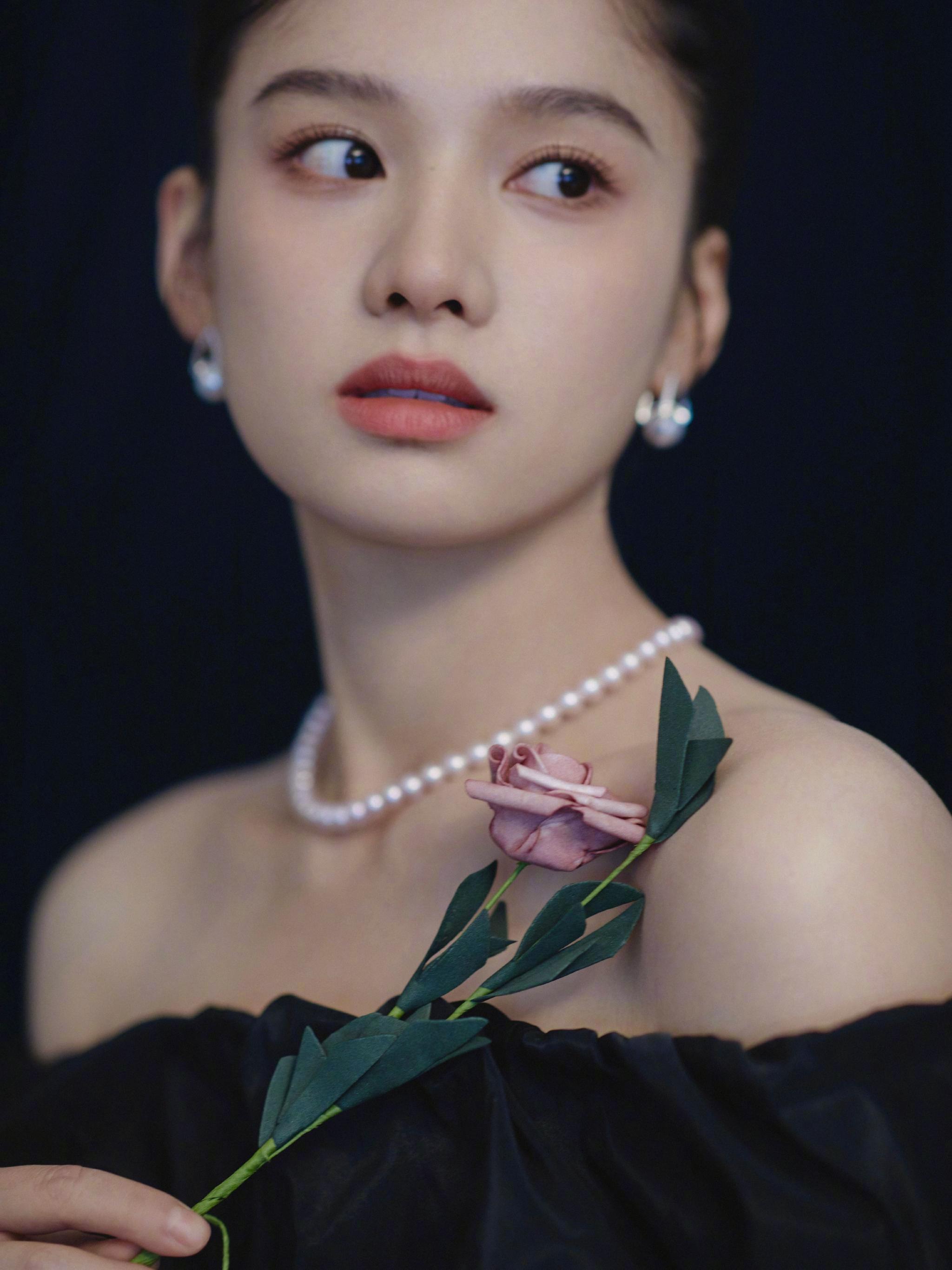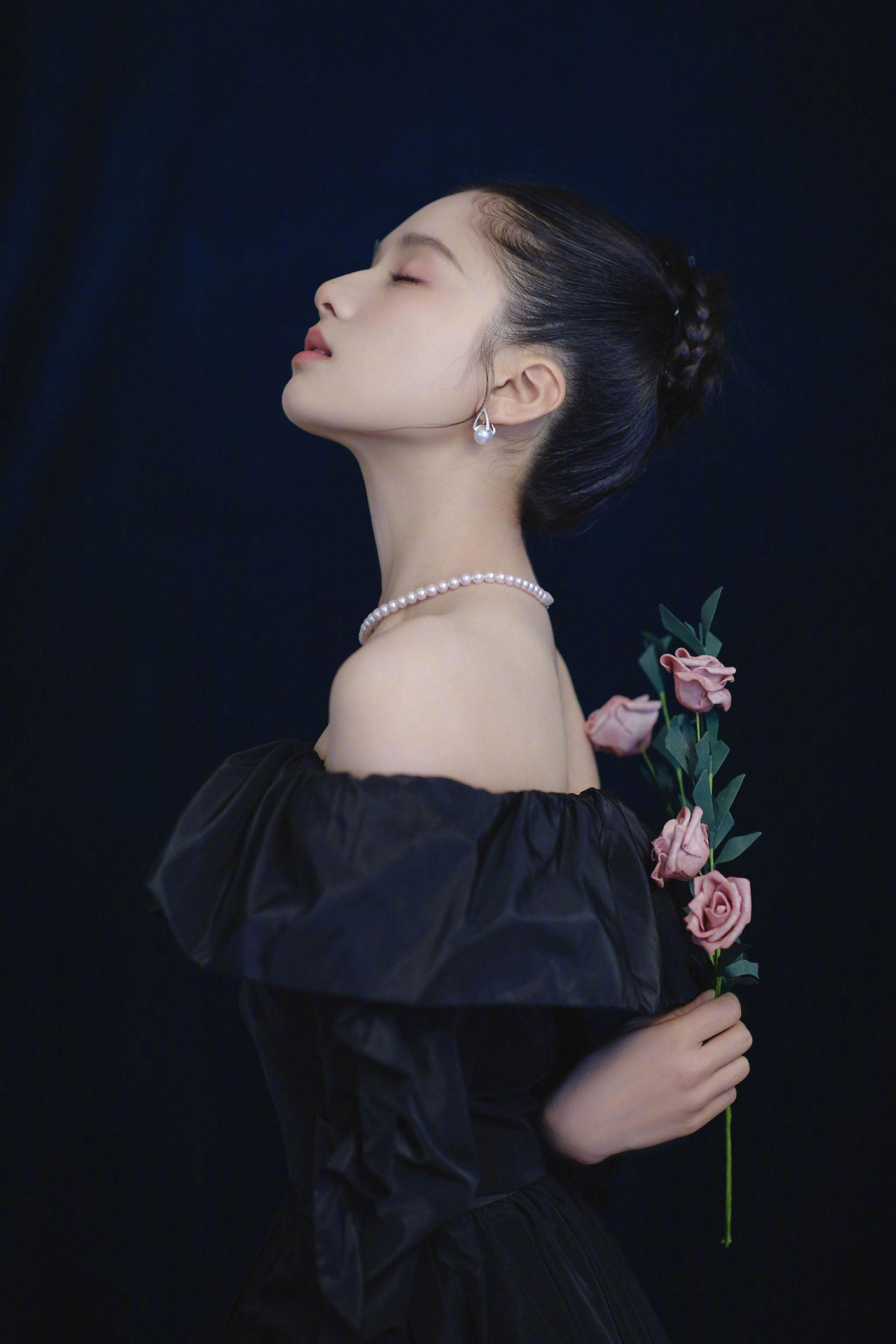 #张婧仪无名首映礼工作室出图# 张婧仪一身黑色小礼裙,搭配白色珍珠项链,手捧紫色玫瑰花,小公主驾到啦!
