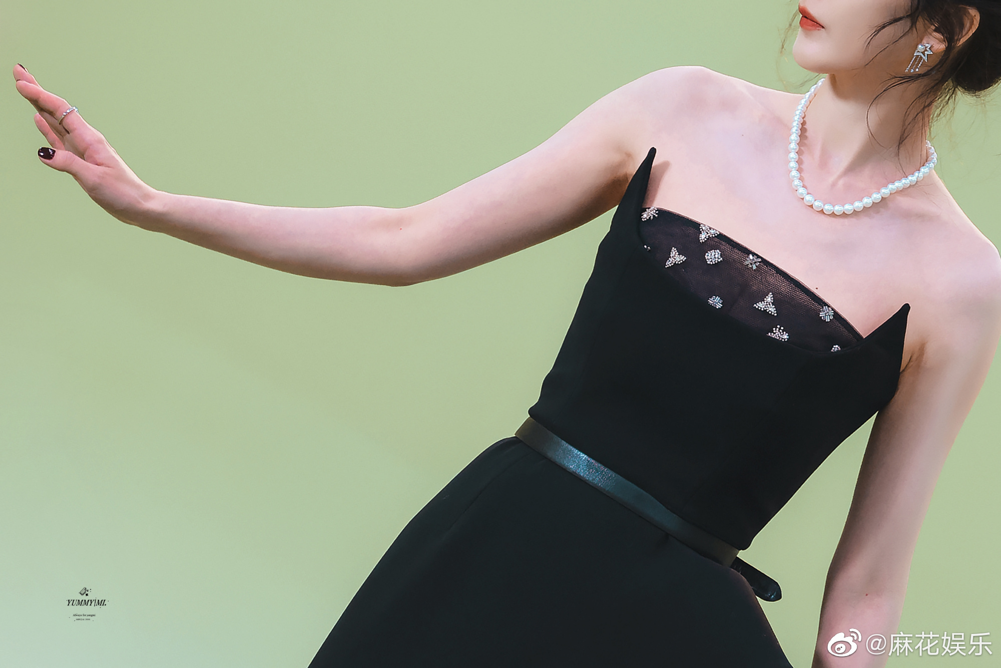 杨幂女士今天别太美黑裙盘发,珍珠项链点缀,精致优雅的恰到好处。
