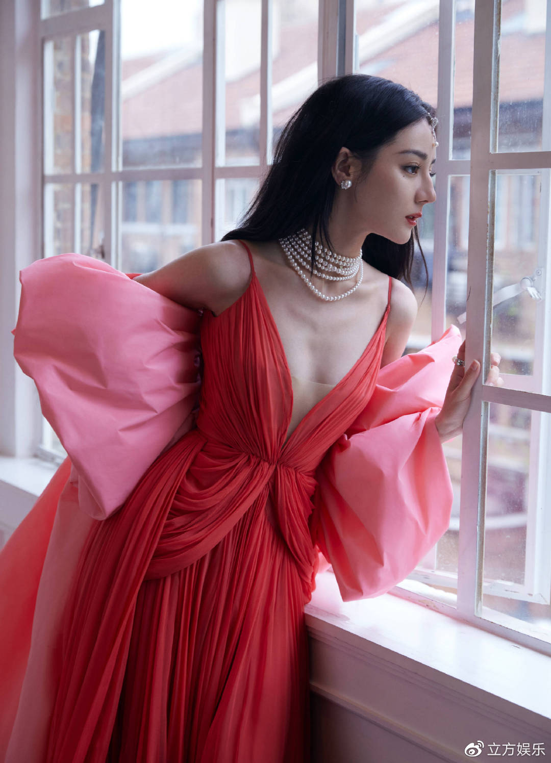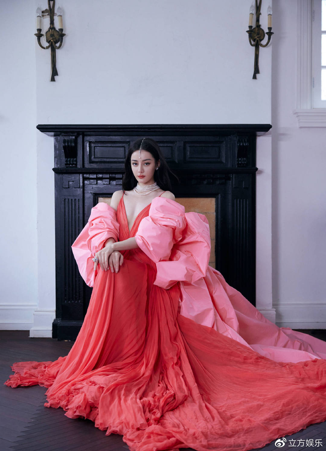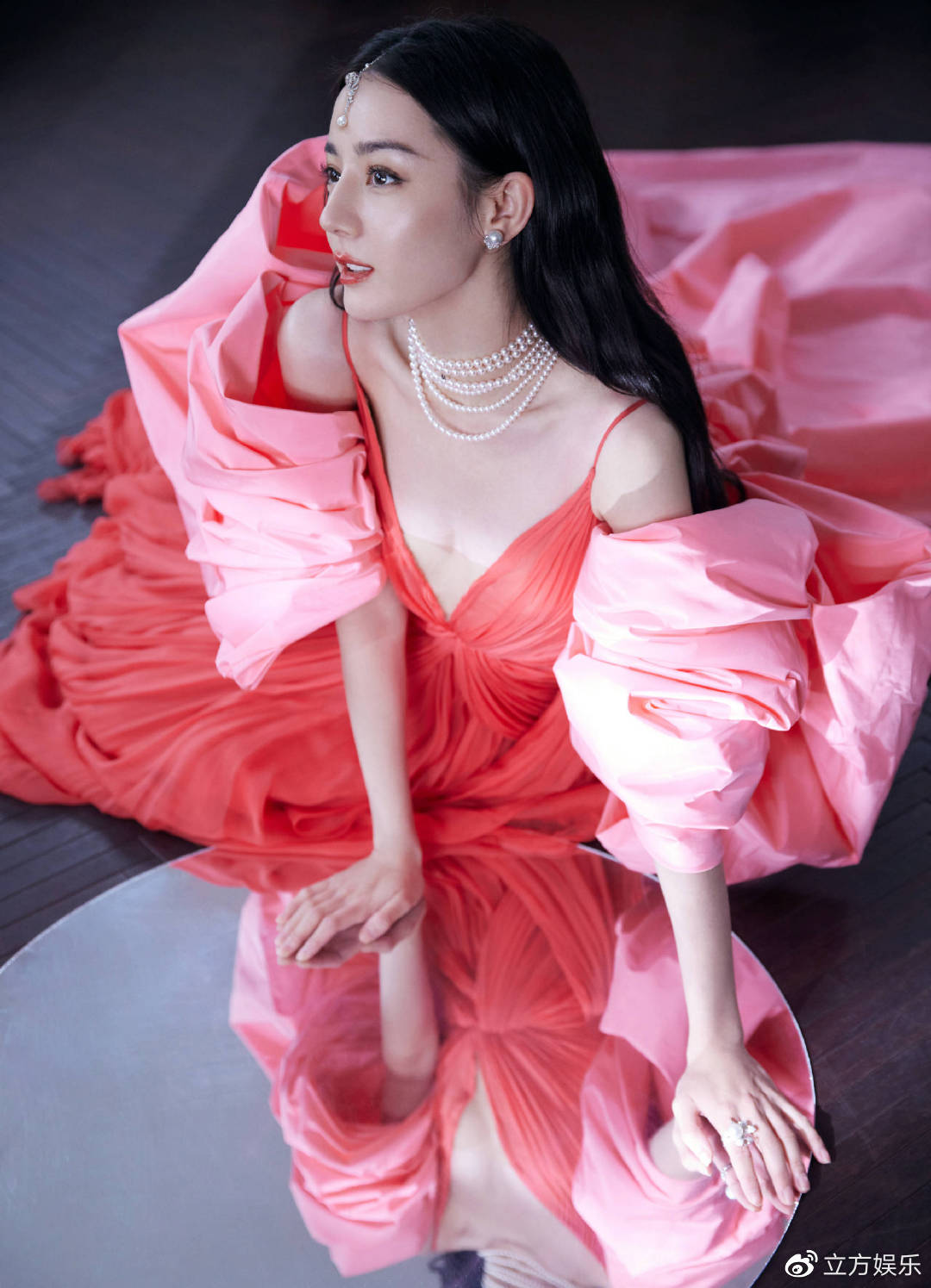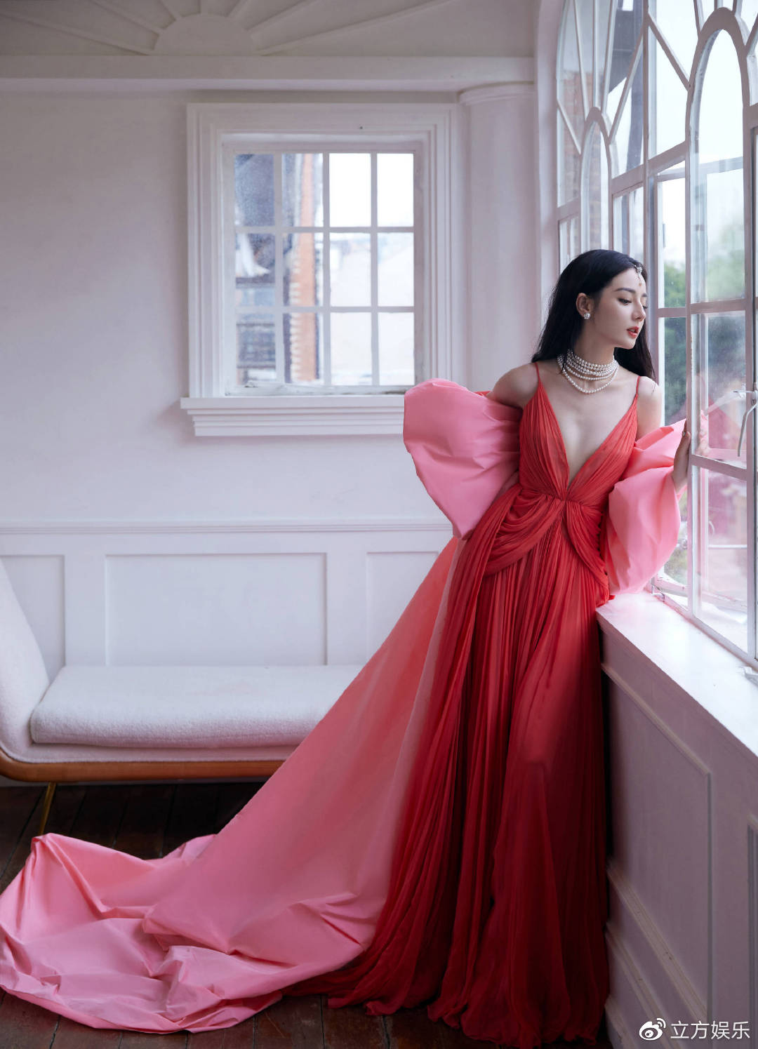 近日,迪丽热巴工作室晒出了迪丽热巴的第二组造型图,一套大开大合的粉红深V裙。