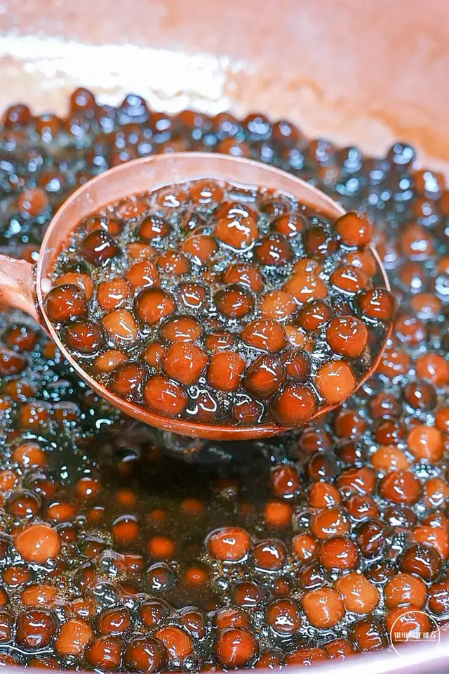 品质极佳的手工老红糖,自带的馥郁红糖香气。将红糖和只含有木薯粉的珍珠小火慢慢熬煮,小哥不停地进行搅拌,耐心将珍珠闷煮至粘稠,最后得到浓稠不腻,颗颗分明的手工原料。