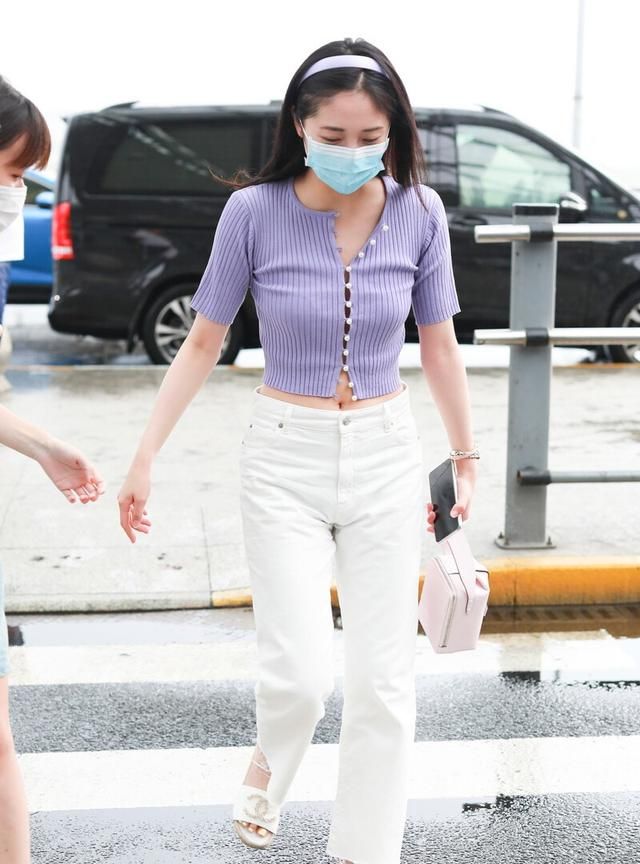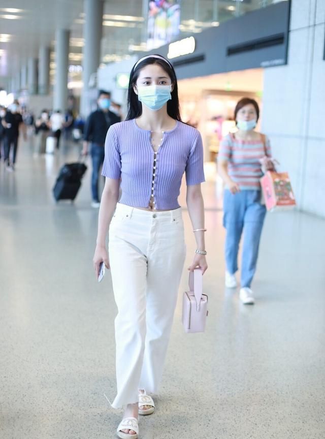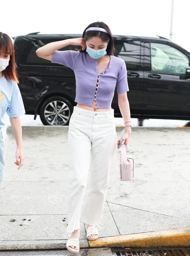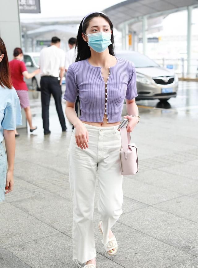 在进行色彩搭配时,周洁琼的选择体现出了少女心和青春活力,与出挑的单品选择正相配。温柔而不失活力的紫色与针织元素相得益彰,而白色直筒裤和拖鞋让整体配色更显轻盈,白与紫的经典搭配简单大方而减龄十足。