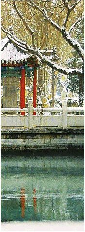 天地间,雪,扑簌飞落。珍珠泉的高大牌坊上,大红灯笼高悬。白雪、红墙、红灯,相得益彰,分外醒目。走进珍珠泉大院,两株迎客松凝雪挂霜,带着残黄枝叶的法桐、白杨、银杏、五角枫,身披银装,傲然挺立。一株株松柏,一簇簇翠竹、冬青、石楠等常绿植物,裹着雪绒,透着醒目的绿。古香古色的建筑,大道小径,花坛花钵,贴地皮生长的草坪……都积着白雪,一片素雅洁白。一片雪地上,一群年轻人趁扫雪小憩间隙,兴致盎然地打起雪仗,惹得青春远去的我心痒痒的。